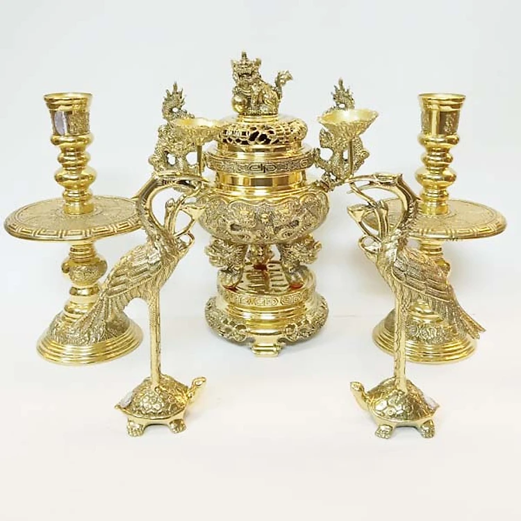 Bộ đỉnh bày bày thờ gia đỉnh nhỏ, bộ ngũ sự gồm 1 đỉnh + 2 hạc + 2 nến đồng