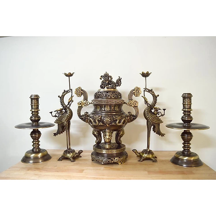 Bộ đỉnh thờ cúng này bao gồm 1 đỉnh + hai con hạc + 2 cây đèn nến.