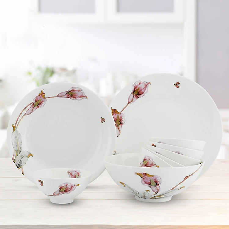 - Bộ gồm: 6 chén cơm 11.5cm, 1 dĩa tròn ảo 26cm, 1 dĩa tròn sâu 23cm, 1 tô trung 20cm.