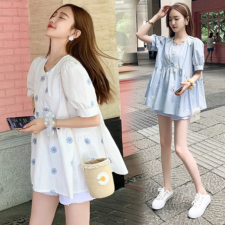 Bộ Đồ Bầu Mặc Hè Sang Chảnh Áo Ngắn Tay Quần Short Có Chun Chỉnh Bụng Họa Tiết Hoa Nhẹ Nhàng