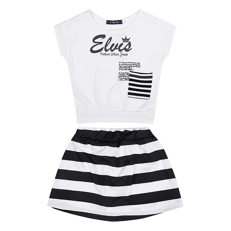 Đồ có thiết kế năng động và vô cùng đáng yêu. Kiểu áo cổ tròn, tay con bo gấu, phom ôm vừa phải cùng dòng chữ “ELVIS” được in nổi bật. Phần túi sọc trắng - đen được may phối tạo điểm nhấn cho áo. Chân váy đầy cá tính với sọc ngang trắng - đen, lưng thun với phom ôm nhẹ, tạo sự thoải mái cho bé.