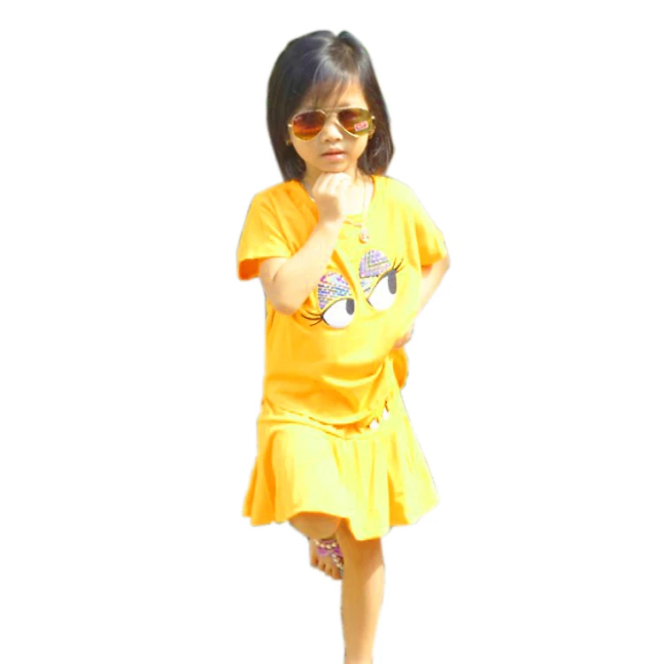 Đồ có thiết kế vô cùng đáng yêu với kiểu áo cổ tròn, áo cánh dơi tay rộng. Quần thiết kế giả váy với lớp xếp ly duyên dáng, cho bé yêu thêm phần phần xinh xắn. Điểm nhấn của bộ đồ nằm ở họa tiết mắt liếc điệu đà được thêu trên quần và áo. Sắc vàng năng động và nổi bật, mang lại vẻ ngoài tươi vui cho bé.