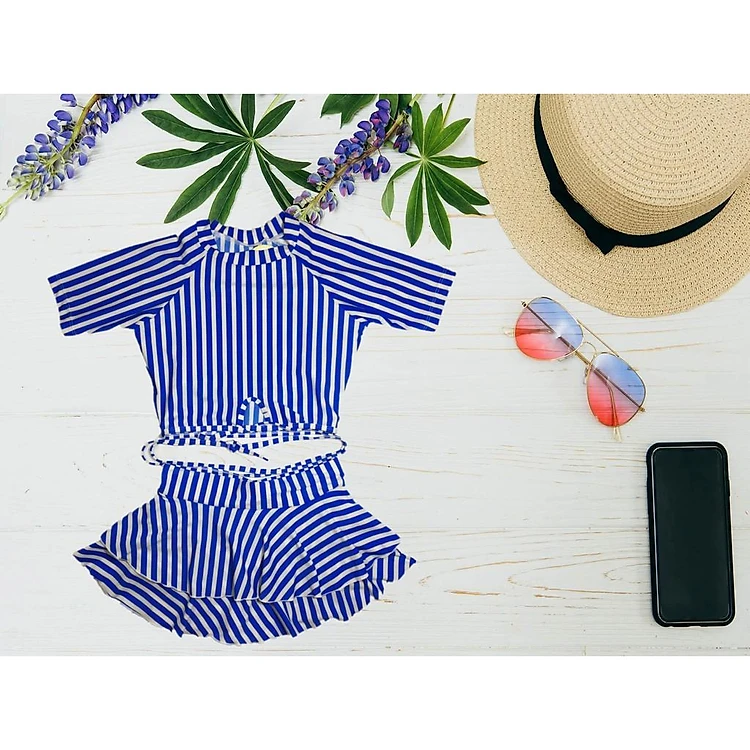 Bộ đồ bơi bé gái tay ngắn vãi sọc đáng yêu 30-41kg - quần giả váy áo tay ngắn - Đồ bơi 2 mãnh - Hương Nhiên