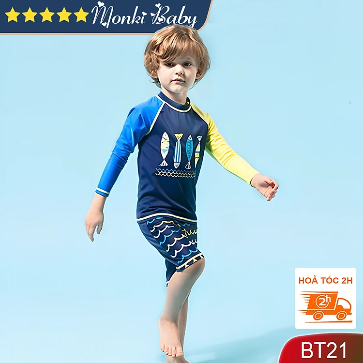 Bộ đồ bơi bé trai dài tay chống nắng kèm mũ bơi vải, chất thun bơi lạnh đẹp mịn mát, co giãn đa chiều, ít thấm nước, mau khô, sắc màu trẻ trung mạnh mẽ | BT21