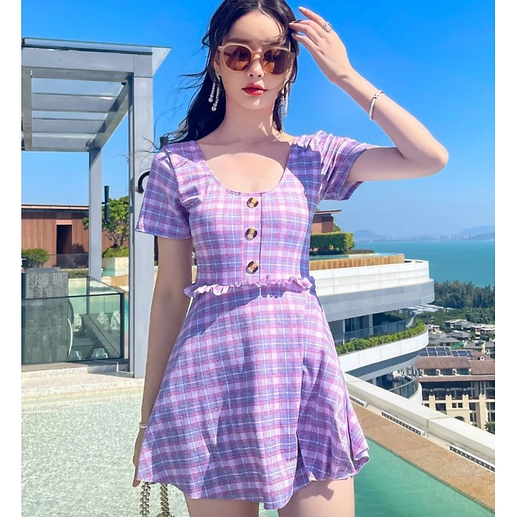 Bộ đồ bơi bikini kín đáo nữ giấu bụng đi tắm biển váy liền áo cộc - B.45