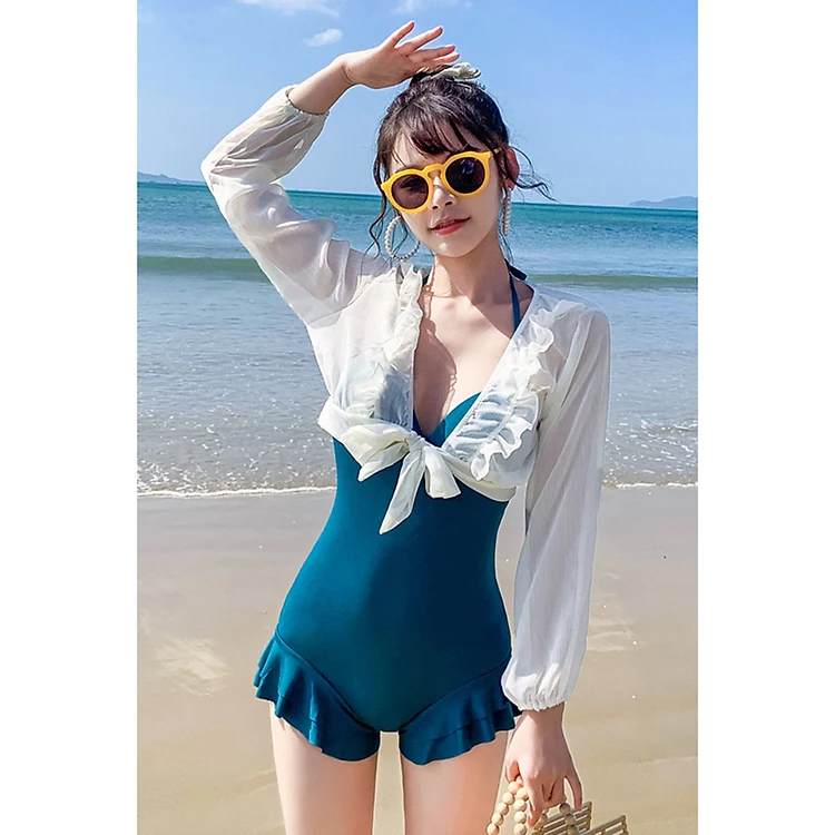 Bộ đồ bơi bikini nữ 1 mảnh đi tắm biển màu xanh kèm áo croptop trắng sang chảnh tôn dáng phong cách Hàn quốc - B04