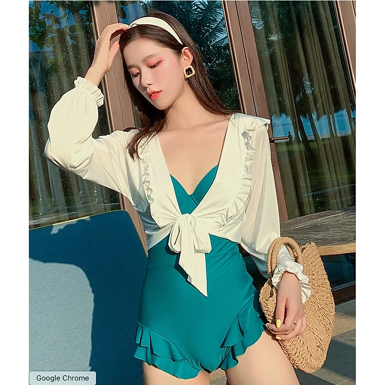 Bộ đồ bơi bikini nữ 1 mảnh giấu bụng tôn dáng đi tắm biển kèm áo ren trắng khoác ngoài chống nắng - B. 04