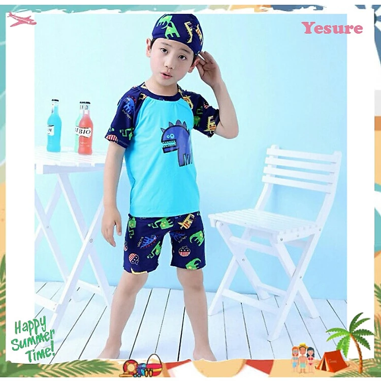 Bộ Đồ Bơi Khủng Long Xanh Dành Cho Bé Trai CaoTừ 85cm - 125cm chất vải Polyeste thân thiện với trẻ em, mau khô, thấm hút mồ hôi tốt, thiết kế thời trang bắt mắt - Tặng kèm nón bơi vải cùng màu