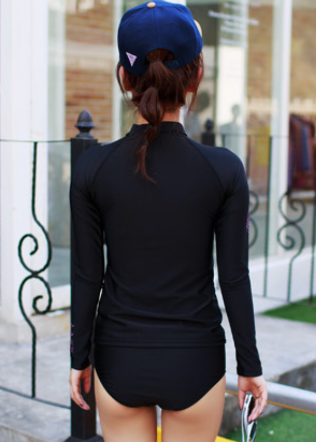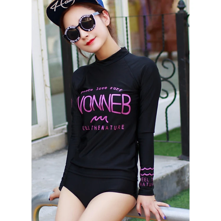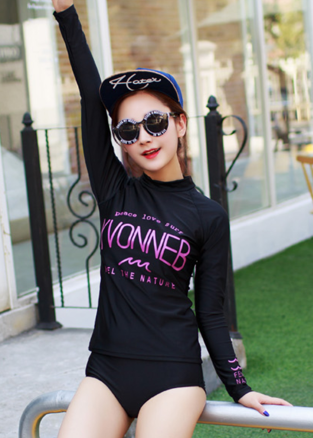 Đồ Bơi Nữ Hai Mảnh Đồ Bơi Tay Dài Che Nắng Thun Lạnh Bền Đẹp Màu Đen Thêu Chữ Hồng AT061: nâng ngực gợi cảm, với tay dài, ôm sát tôn dáng, quân liền thân. Kiểu dáng mới lạ, mạnh mẽ và không kém phần gợi cảm cho bạn gái.