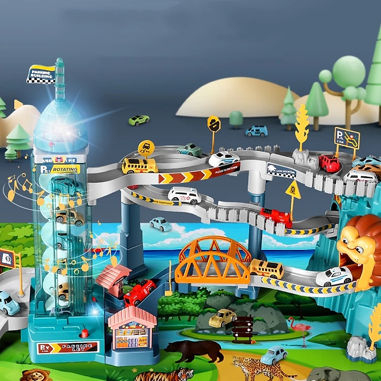 Bộ đồ chơi đường hầm sư tử, đồ chơi đua xe ô tô qua đường ray kết hợp bãi đỗ xe cao cấp, quà tặng sinh nhật cho bé