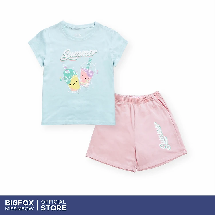 Bộ đồ cộc tay bé gái Bigfox Miss Meow size đại mặc nhà mùa hè vải cotton cho trẻ em 3-11 tuổi 35kg