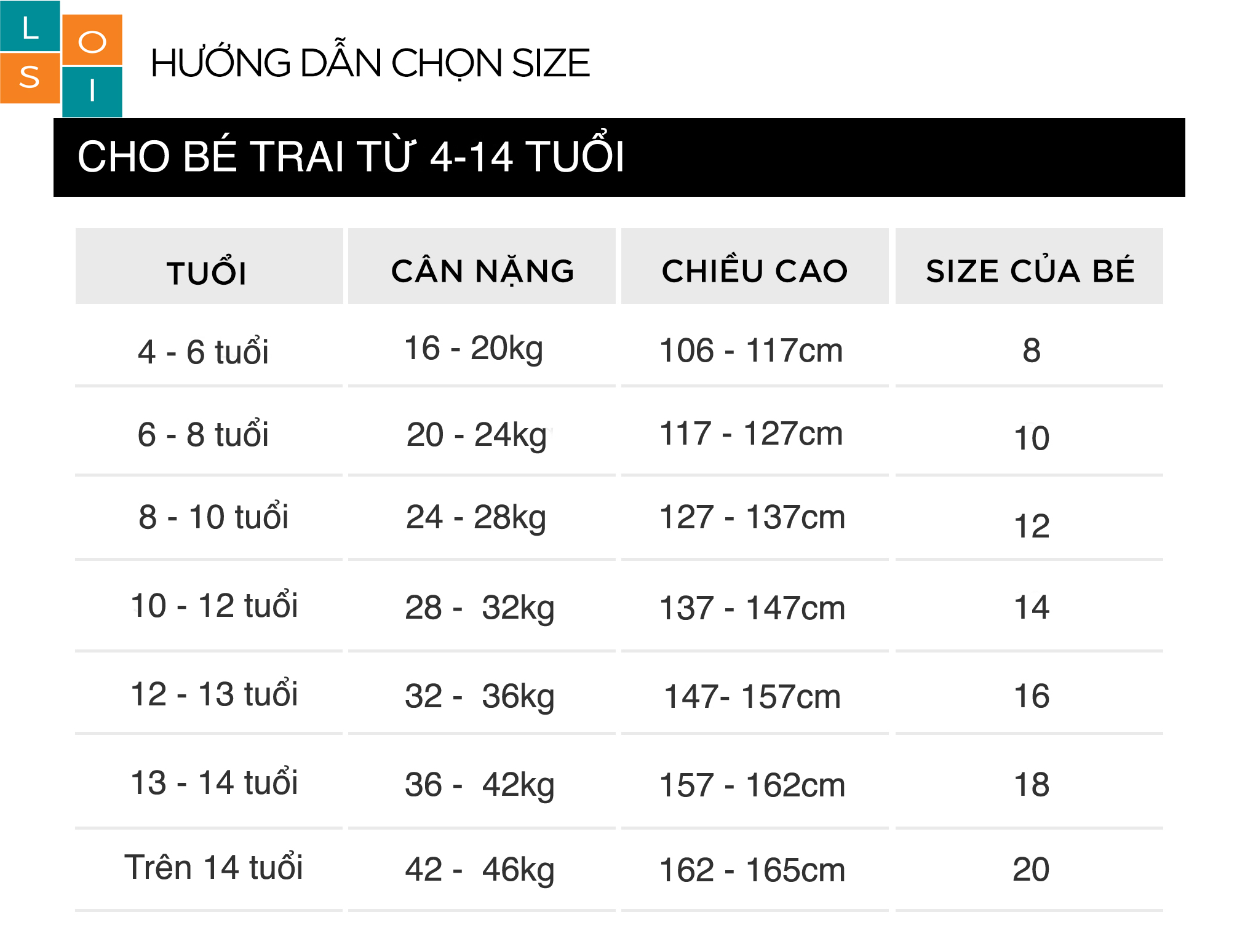 Quý khách xem bảng size dưới đây để chọn đúng cho bé nhà mình