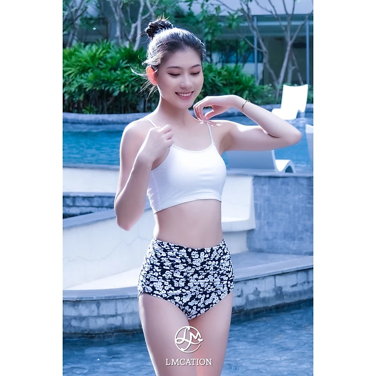 Bộ đồ bikini LMcation - Áo bikini thể thao LMcation Elisa Màu trắng & Quần Bơi Nữ Kiểu Nhún LMcation Sasha Hoa Nhí Trắng Đen