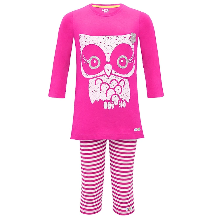 Bộ đồ được in hình ảnh cô nàng cú mèo điệu đà và đáng yêu sẽ làm bé gái thích mê ngay từ lần đầu nhìn thấy. Sản phẩm có màu hồng đậm chủ đạo góp phần tô điểm vẻ dễ thương và tươi tắn.