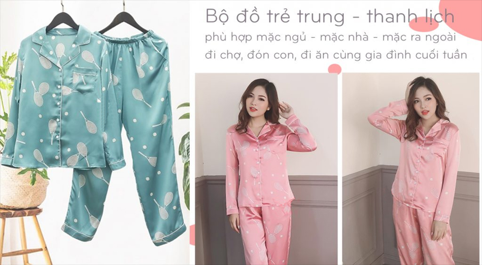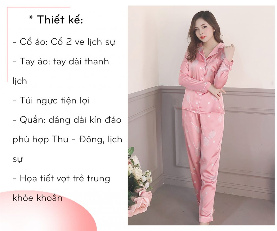 Bộ đồ mặc nhà nữ dáng dài lịch sự chất lụa satin cao cấp họa tiết hình vợt H094