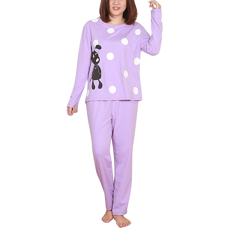- Áo được in họa tiết chấm bi màu trắng cùng hình chú chó màu đen nổi bật trên nề vải màu tím nhẹ nhàng, tạo điểm nhấn độc đáo cho sản phẩm.