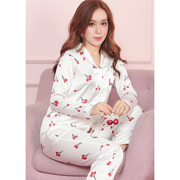 Bộ đồ ngủ lụa nữ tay dài quần dài họa tiết trái cherry cao cấp H077