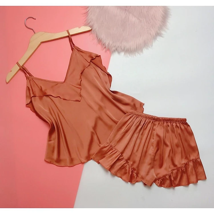 Bộ đồ ngủ nữ mặc nhà 2 dây lụa cao cấp mềm mại hàng thiết kế Màu Cam .