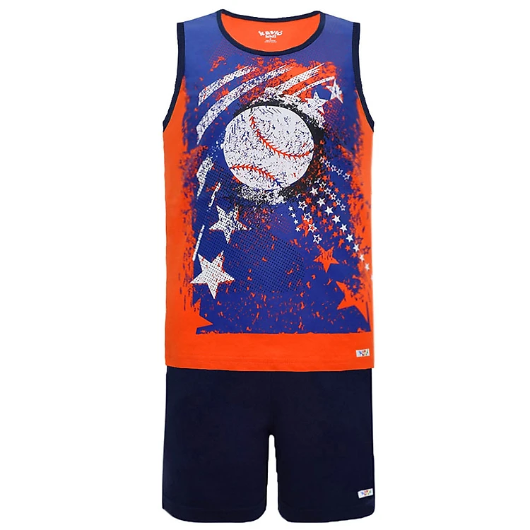 Bộ đồ in hình theo cảm hứng thể thao với quả bóng, ngôi sao cùng những vệt màu độc đáo. Sản phẩm có màu cam tươi tắn sẽ giúp cho các bé trông thật nổi bật và sành điệu.