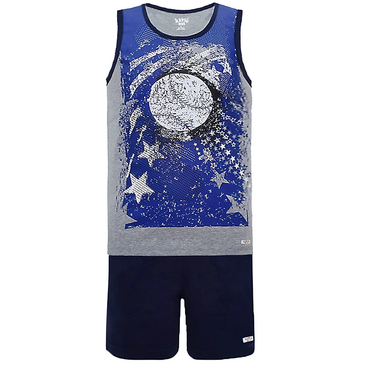 Bộ đồ in hình theo cảm hứng thể thao với quả bóng, ngôi sao cùng những vệt màu độc đáo. Sản phẩm có màu xám chủ đạo tạo nên phong thái thanh lịch và ưa nhìn cho các bé.