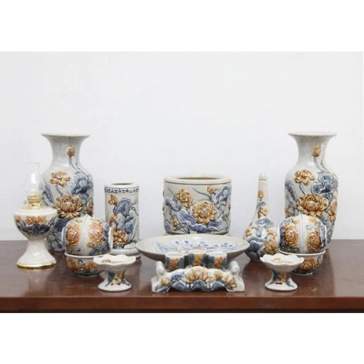 Bộ đồ thờ men rạn đắp nổi hoa sen - ban thờ 1.27m