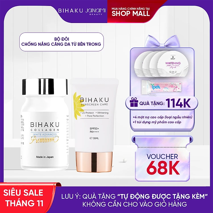 Bộ đôi chống nắng dưỡng trắng da PREMIUM COLLAGEN hộp 30v và BIHAKU SUNSCREEN CARE SPF50+ PA++++ tuýp 35ml giúp hạn chế vấn đề cháy nắng và dưỡng trắng chống lão hóa