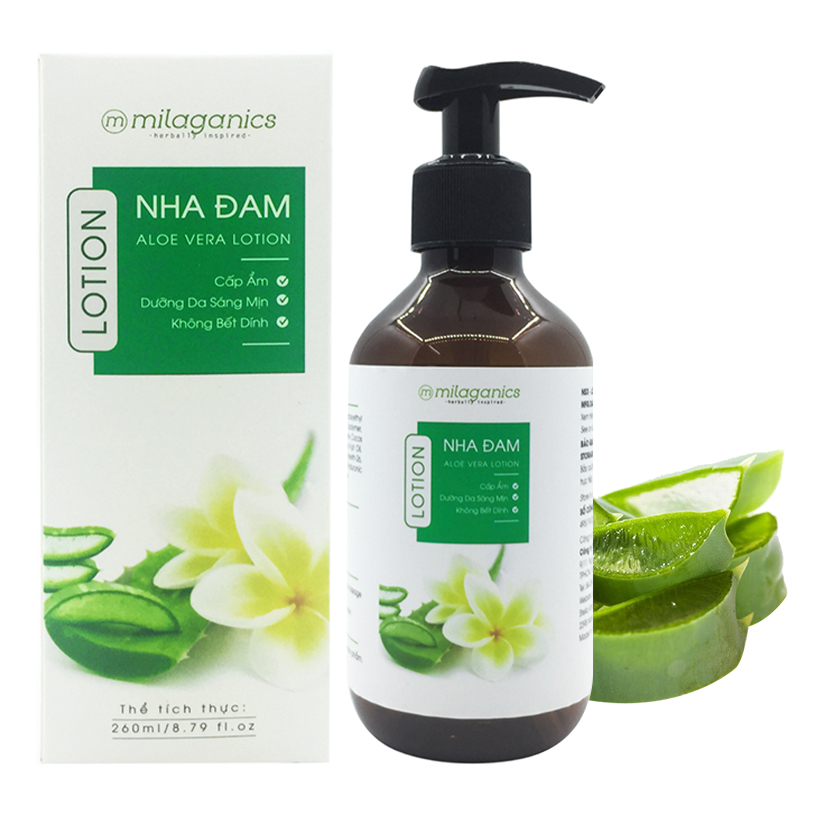 - Lotion nha đam Milaganics với bảng thành phần gồm những nguyên liệu có nguồn gốc từ thiên nhiên như nha đam, chiết xuất dầu dừa, dầu olive, dầu argan giúp làm mềm da, cấp ẩm, giảm kích ứng. Đồng thời, sản phẩm còn được bổ sung thêm vitamin E, B5 và HA (Hyaluronic Acid) giúp sản sinh collagen, tái tạo làn da căng hồng sáng mịn, ngăn ngừa lão hóa.
