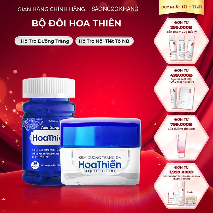 Bộ Đôi Trong Uống Ngoài Thoa Cân Bằng Nội Tiết, Dưỡng Trắng Sáng Da Viên Uống Hoa Thiên & Kem Dưỡng Trắng Da Hoa Thiên