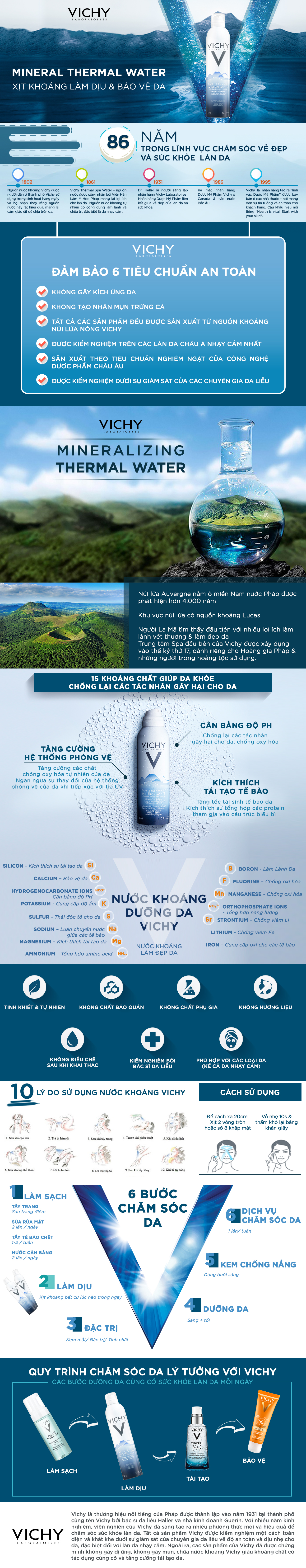 - Xịt khoáng Vichy Mineralizing Thermal Water 300ml với 15 khoáng chất quý hiếm bao gồm sắt, potassium, canxi, manganese, silicon, có tác dụng làm dịu, củng cố và làm đẹp da tuyệt vời.