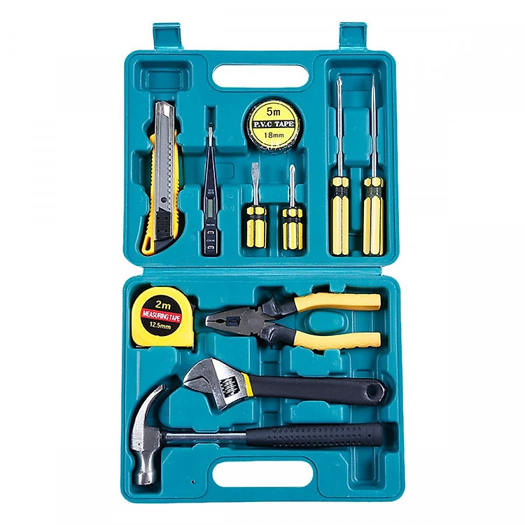 - Sản phẩm gồm 12 món: cờ lê, mỏ lết, kìm, búa, tua vít, lục lăng, bút điện, keo, thước, dao dọc giấy, thước kéo, băng dính điện.