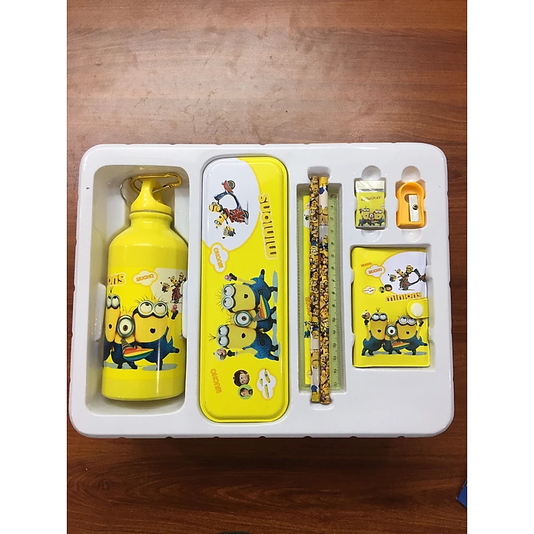 Hộp Dụng Cụ Học Tập 8 Món Nhiều Mẫu Dễ Thương bao gồm: 1 Bộ gồm 8 món: 1 sổ, 2 bút chì, 1 thước, 1 gôm, 1 chuốt bút, 1 hộp bút, 1 bình nước