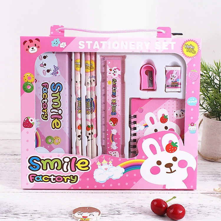 Bộ dụng cụ học tập cho học sinh tiểu học bao gồm 1 hộp bút nhôm, bền đẹp, 3 bút chì, 1 thước kẻ 15cm, 1 gôm tẩy bút chì, 1 đồ gọt bút chì và 1 tệp sổ mini cầm tay dễ thương cho bé.