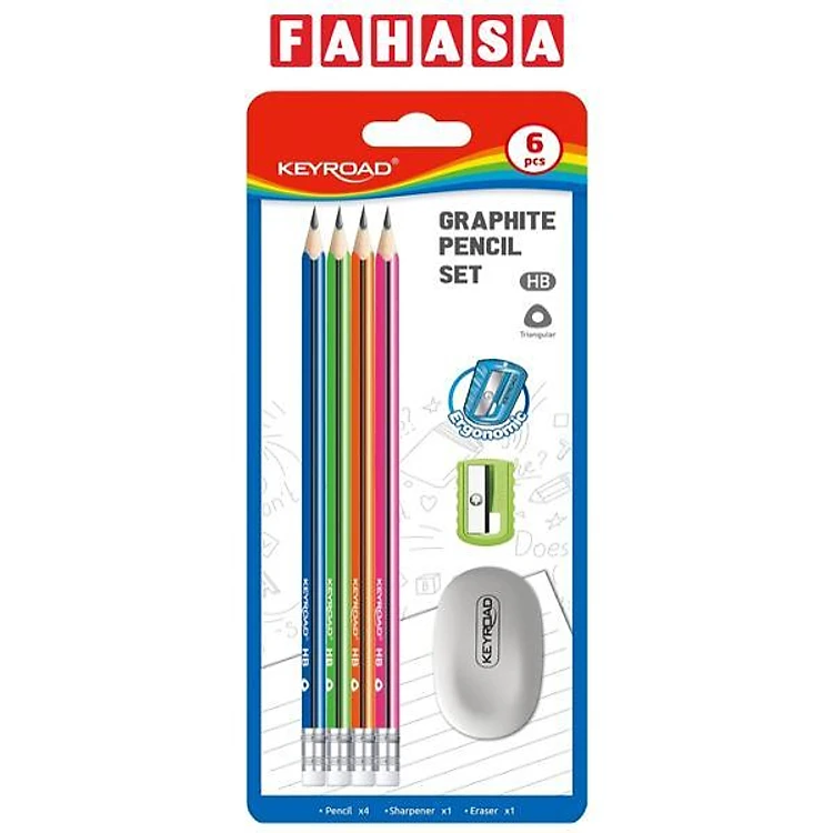 - Bộ dụng cự gồm : 4 bút chì HB tam giác + 1 gọt bút chì + 1 gôm tẩy.