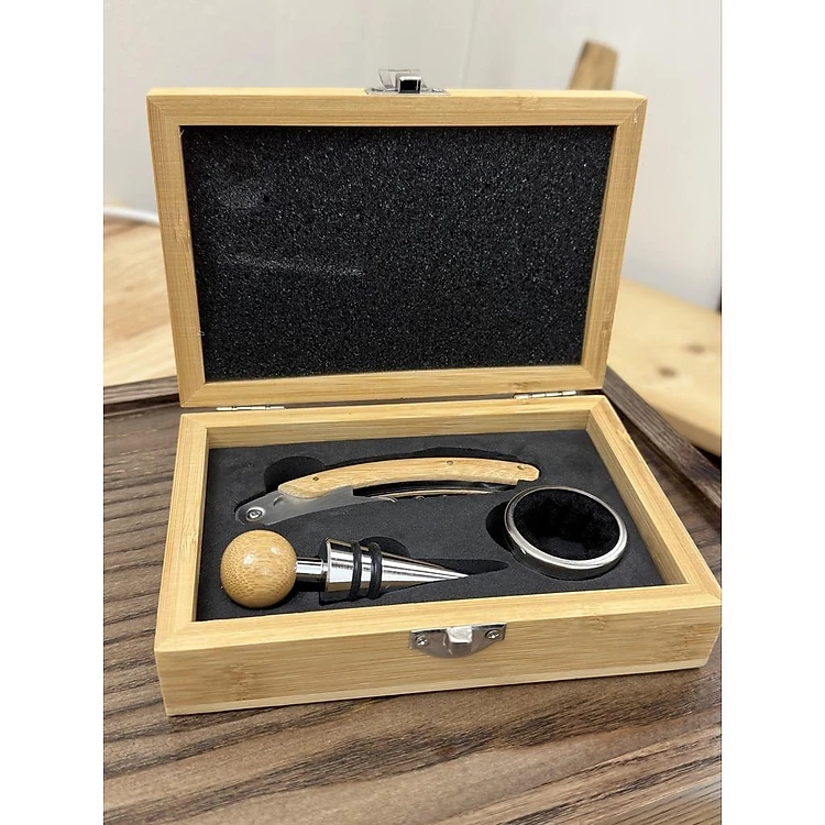 Bộ dụng cụ mở nắp chai rượu vang ONGTRE bằng tre tiện dụng, khắc tên làm quà tặng cho công ty doanh nghiệp