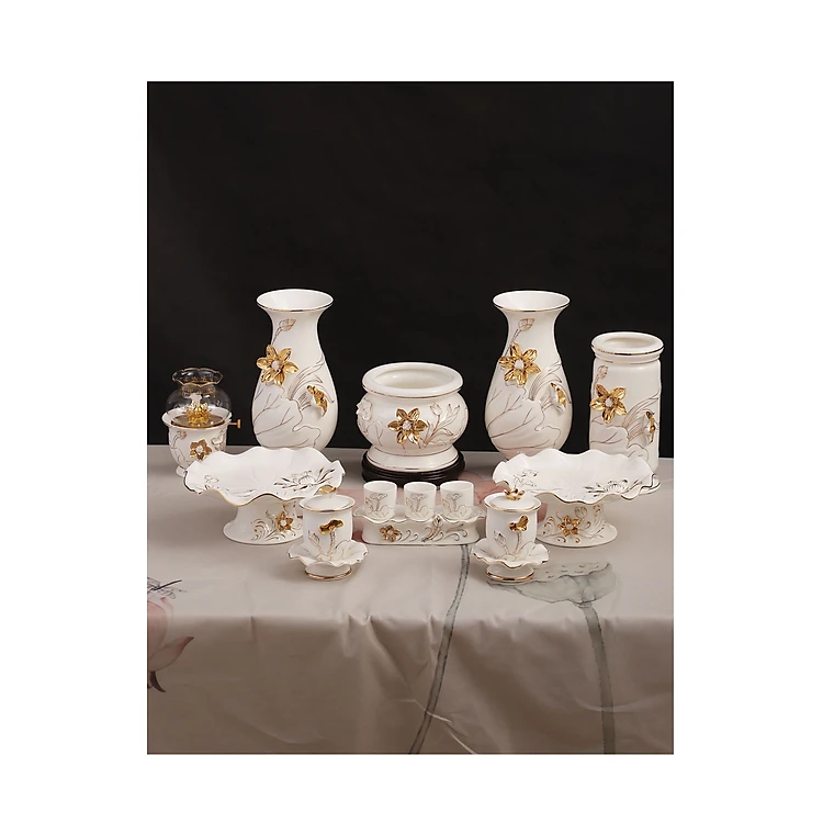 BỘ SẢN PHẨM THỜ CÚNG THƯỜNG BAO GỒM: 1 bát hương (lu hương), 2 bình bông, 2 đĩa trái cây, 3 hoặc 5 ly nước, 1 hoặc 2 đế nến, 3 chun nước (hũ gạo), 1 ống nhang, 1-2 đèn