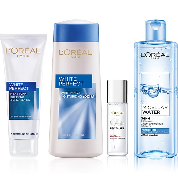 • Nước cân bằng White Perfect - Với hoạt chất PRO-EXFOLIATINE được nghiên cứu bởi viện nghiên cứu L oreal Paris của thương hiệu Mỹ Phẩm L oreal giúp lấy đi tế bào chết, cho da mềm mịn, dễ dàng hấp thu dưỡng chất từ các bước dưỡng da tiếp theo, giúp cân bằng độ ẩm, thanh khiết & se khít lỗ chân lông.