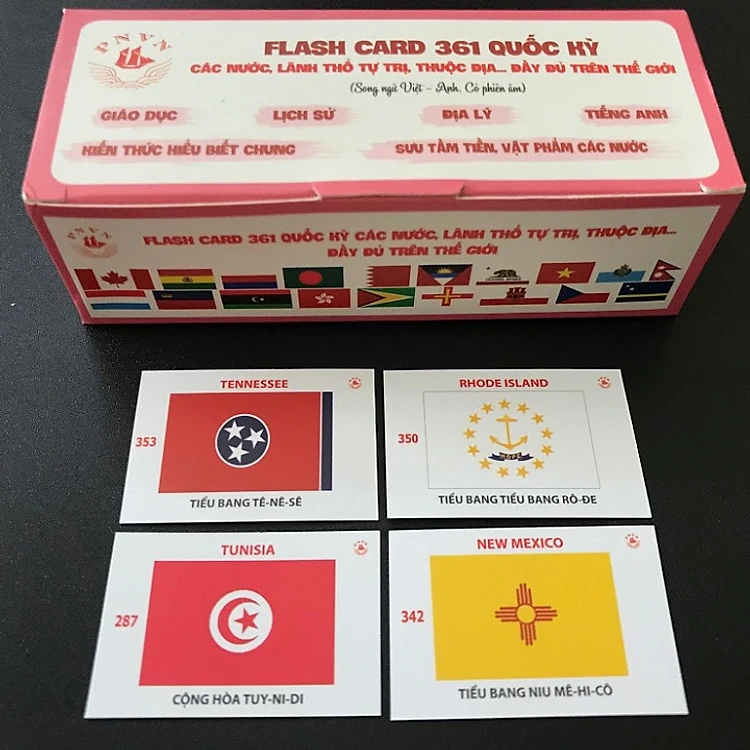 Bộ flash card 361 lá cờ quốc kỳ của các quốc gia vùng lãnh thổ là một bộ gồm 361 tấm flash card làm bằng bìa cứng, trên đó được in màu quốc kỳ và tên của 361 các quốc gia và vùng lãnh thổ trên toàn thế giới bằng tiếng Anh và phiên âm tiếng Việt. Làm phong phú hơn cho vốn hiểu biết hoặc bộ sưu tập của bạn và cũng là món quà tặng bạn bè người thân độc đáo và thú vị.