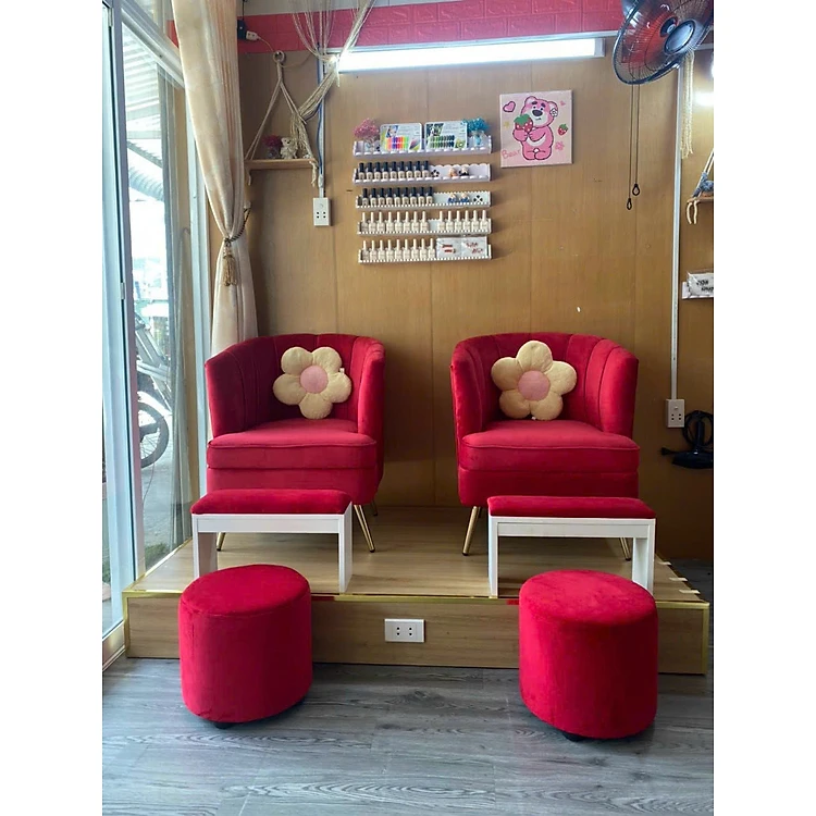 Bộ ghế nail Juno Sofa Bao gồm 2 ghế, 2 kệ chân, 2 đôn ngồi và 2 gối trang trí