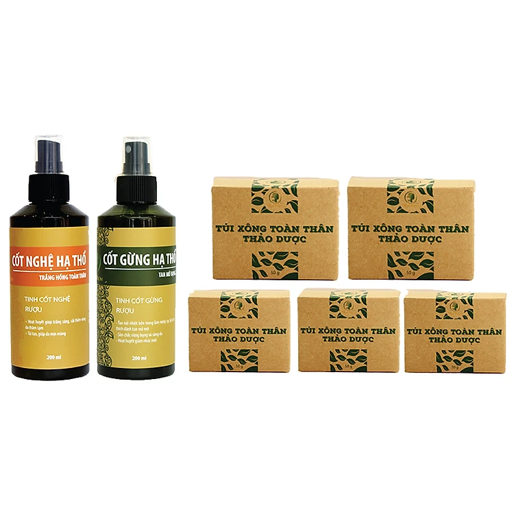 - Bộ sản phẩm bao gồm: 1 chai cốt gừng hạ thổ 200ml, 1 chai cốt nghệ hạ thổ 200ml, 5 hộp túi xông toàn thân (50g/hộp)