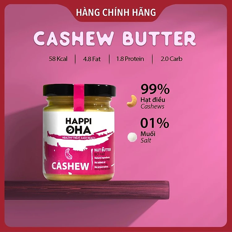 - Hàm lượng dinh dưỡng: Trong 100gr Bơ hạt điều mịn Happi OHA chứa 587 cal với 18g đạm, 20g tinh bột và 49gr chất béo