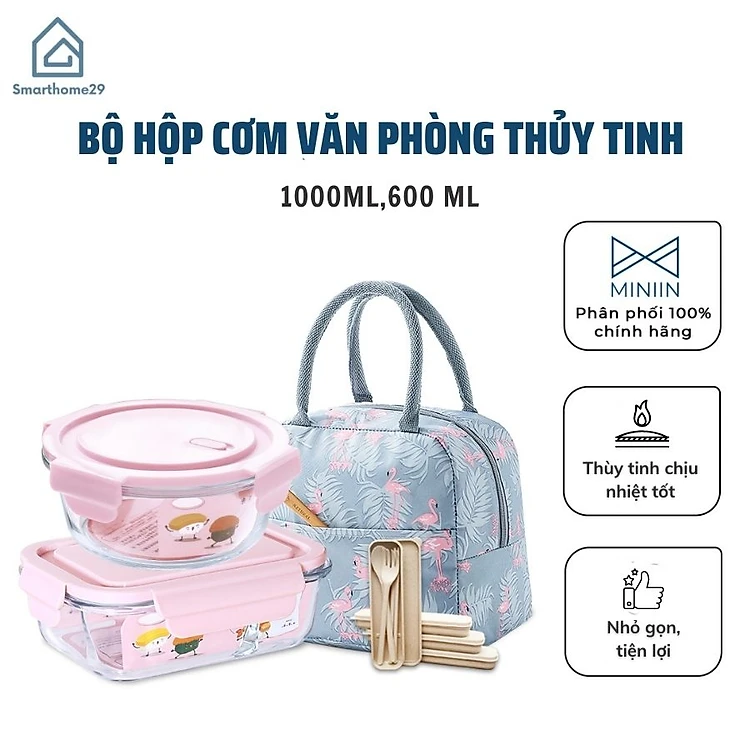 Bộ Hộp Cơm Văn Phòng, Chất Liệu Thủy Tinh Chịu Nhiệt Tốt, Nắp Nhựa PP Cao Cấp An Toàn Sức Khoẻ Tặng Kèm Bộ Thìa Đũa Và Túi Xách Tiện Lợi- Hàng Chính Hãng MINIIN