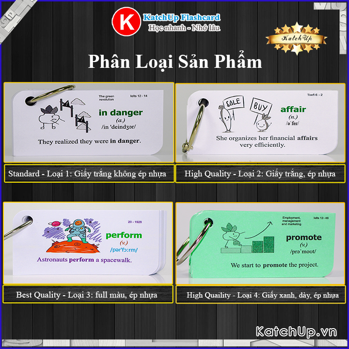 Nội dung giữa các loại đều giống nhau, chỉ khác nhau về tính chất màu giấy, in màu hay không và có ép plastic hay không (riêng loại 3 của 3000 từ vựng thông dụng là chữ và hình đều được in màu, còn TOEIC, IELTS, TOEFL chỉ có chữ được in màu)