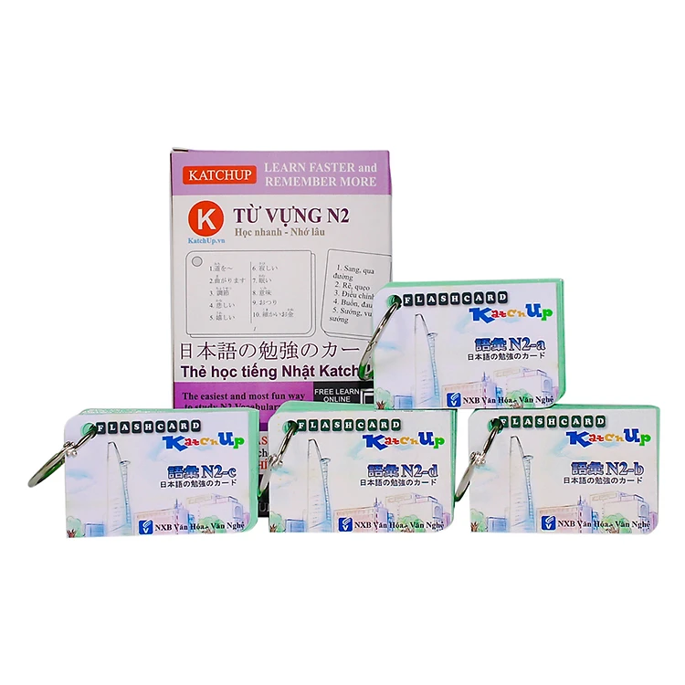 - Bộ KatchUp Flashcard Từ Vựng N2 đầy đủ 4 cuốn, mỗi thẻ gồm: Mặt trước là từ vựng tiếng Nhật, một tấm thẻ có khoảng từ 8 đến 10 từ vựng viết bằng Kanji phiên Hira. Mặt sau là nghĩa tiếng Việt.