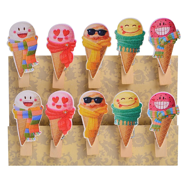 Kẹp gỗ được gia công tỉ mỉ, họa tiết những chú kem ốc quế choàng khăn quàng ngộ nghĩnh được phủ lớp sơn sáng đẹp, không độc hại, an toàn cho sức khỏe.