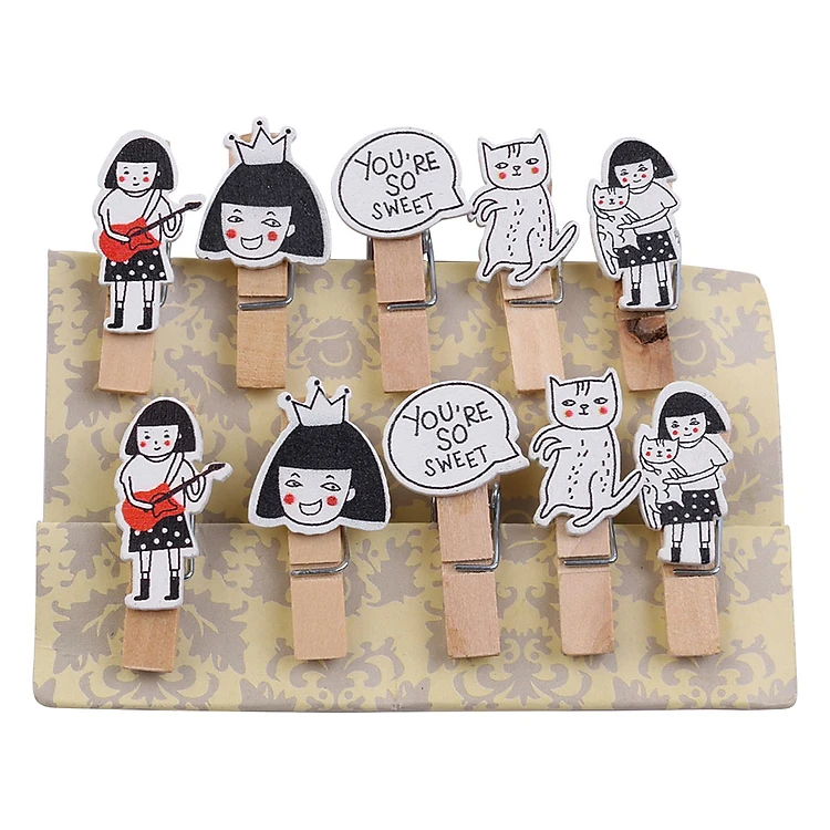 gồm 10 kẹp gỗ nhỏ xinh, sở hữu thiết kế nhỏ gọn, họa tiết hình bé gái đáng yêu, ngộ nghĩnh được gia công từ gỗ, tinh tế trong