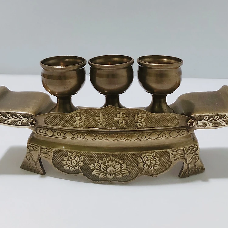 Khay được làm bằng đồng thau có chiều dài 23 cm, rộng 5 cm, cao 7 cm, nặng 0,7 kg trên mặt đủ chỗ đặt 3 chén nước bằng đồng. Mặt trước của khay có 4 chữ nho: "PHÚ QUÝ CÁT TƯỜNG"