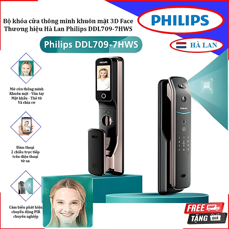 Bộ khóa cửa thông minh khuôn mặt 3D Face, vân tay, thẻ từ, mật khẩu và chìa cơ. Thương hiệu Hà Lan cao cấp Philips DDL709-7HWS. Hàng chính hãng