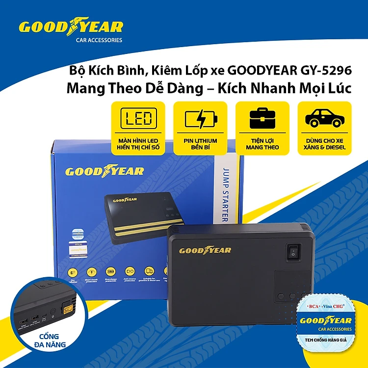 Bộ Kích Bình 400A Kiêm Bơm Lốp Xe GOODYEAR GY-5296 Đa Chức Năng Sạc Dự Phòng 10400mAh Đèn LED Khẩn Cấp - Nhập Khẩu Chính Hãng