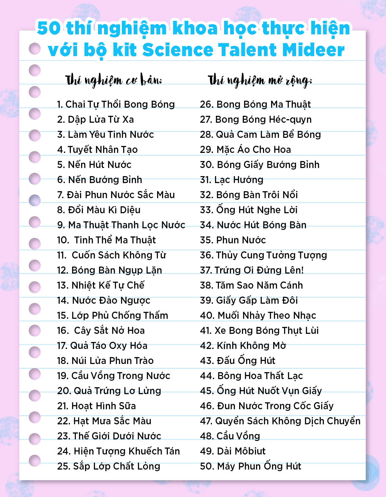 Với Bộ kit 50 thí nghiệm, các bé có thể thực nghiệm 50 thí nghiệm sau: