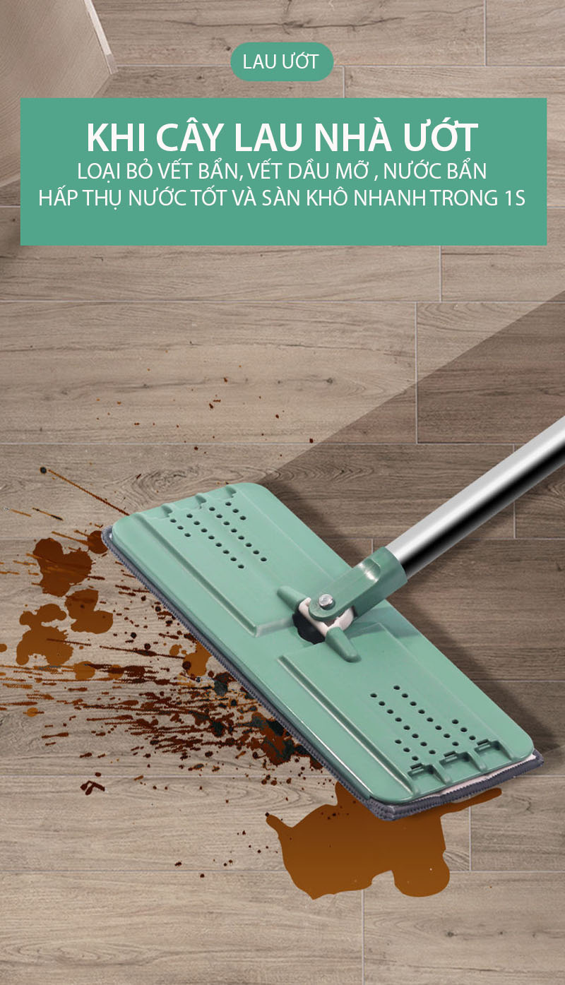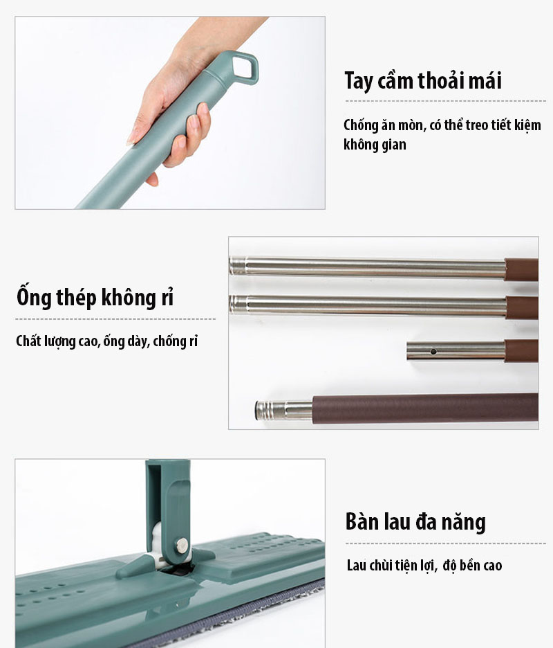- Cây lau sàn phẳng chất liệu inox chắc chắn, bàn lau đa năng xoay 360 độ di chuyển linh hoạt vào những vị trí như gầm tủ, gầm ghế, góc hẹp.